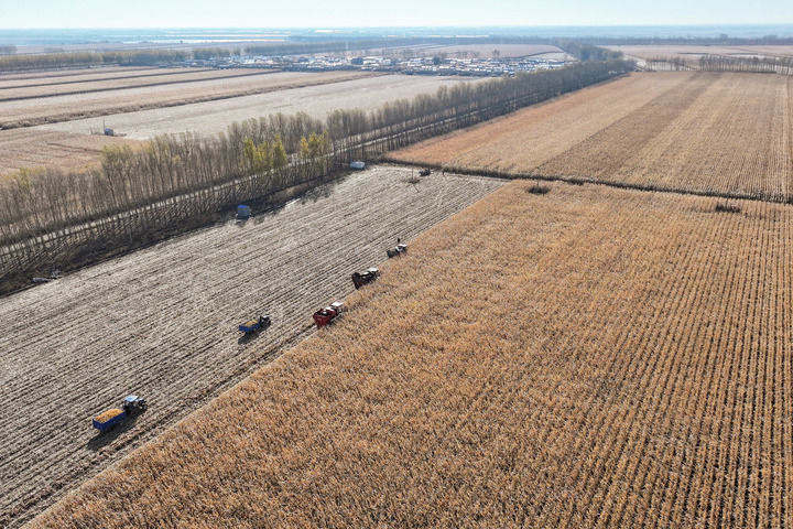 2024年10月16日,在黑龙江省肇东市五里明镇东升村,农民驾驶农机进行收割作业(无人机照片)。新华社记者 谢剑飞 摄