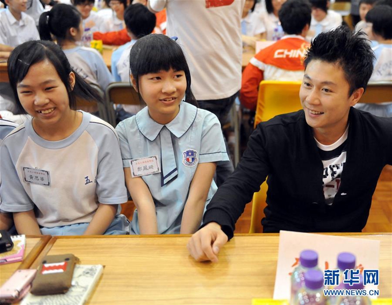 回归祖国20年来,在香港特区政府、社会各界和内地的大力支持下,来自香港的运动员在赛场上争金夺银、屡创佳绩,香港体育蓬勃发展惠及民生。这是前国家体操队队员李小鹏(右)与香港学生交流(2010年5月2日摄)。 (新华社记者 卢炳辉 摄)