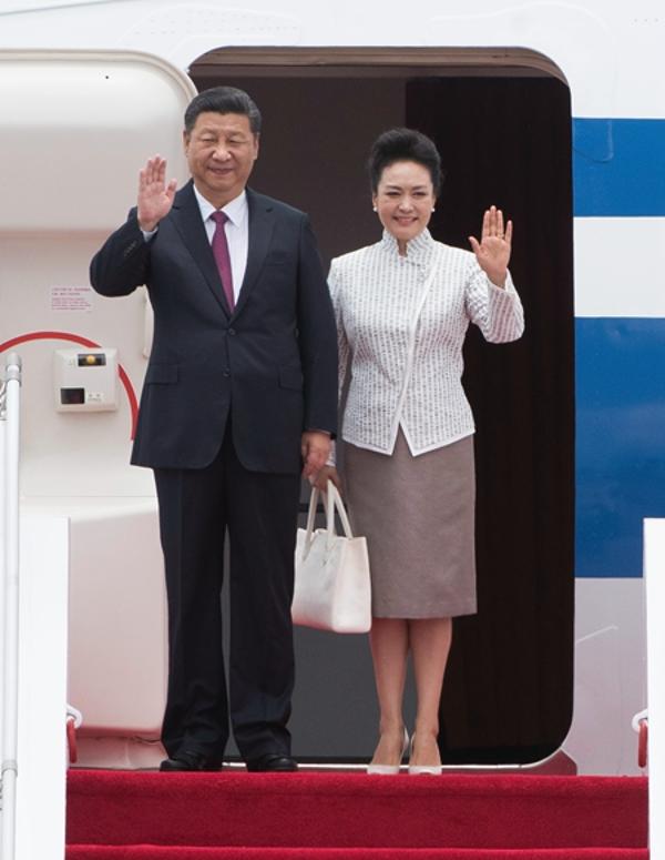 习近平和夫人彭丽媛走出舱门,向欢迎的人群挥手致意。新华社记者 吕小炜 摄