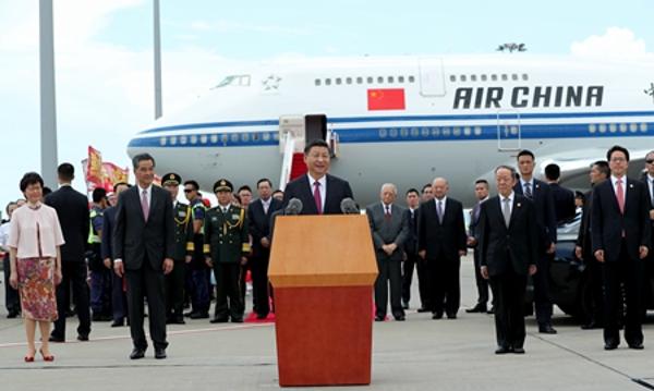 中午12时许,习近平乘坐的专机徐徐降落在香港国际机场。习近平和夫人彭丽媛走出舱门,向欢迎的人群挥手致意。香港警察乐队奏响热情喜庆的欢迎曲,现场顿时沸腾起来。在舷梯旁,两名香港少年向习近平和彭丽媛敬献鲜花。在香港特别行政区行政长官梁振英和夫人梁唐青仪陪同下,习近平和彭丽媛同前来迎接的人员亲切握手。机场上,数百名各界群众代表挥舞手中的国旗、区旗和鲜花,热烈欢迎习近平的到来。
