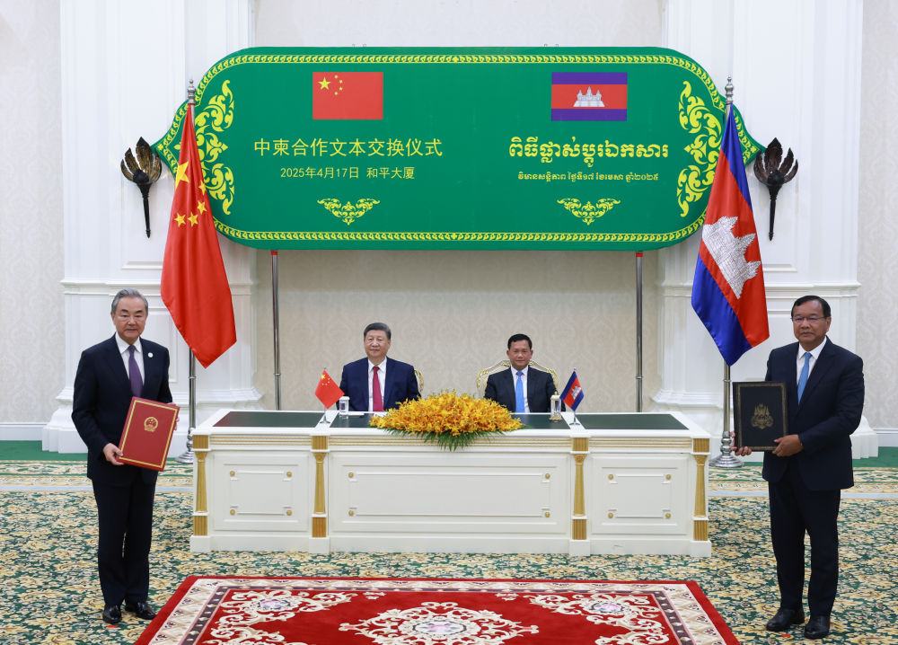 4月17日晚,国家主席习近平同柬埔寨首相洪玛奈在金边和平大厦举行会谈。这是会谈后,两国领导人共同见证中柬双方交换双边合作文本。新华社记者 王晔 摄