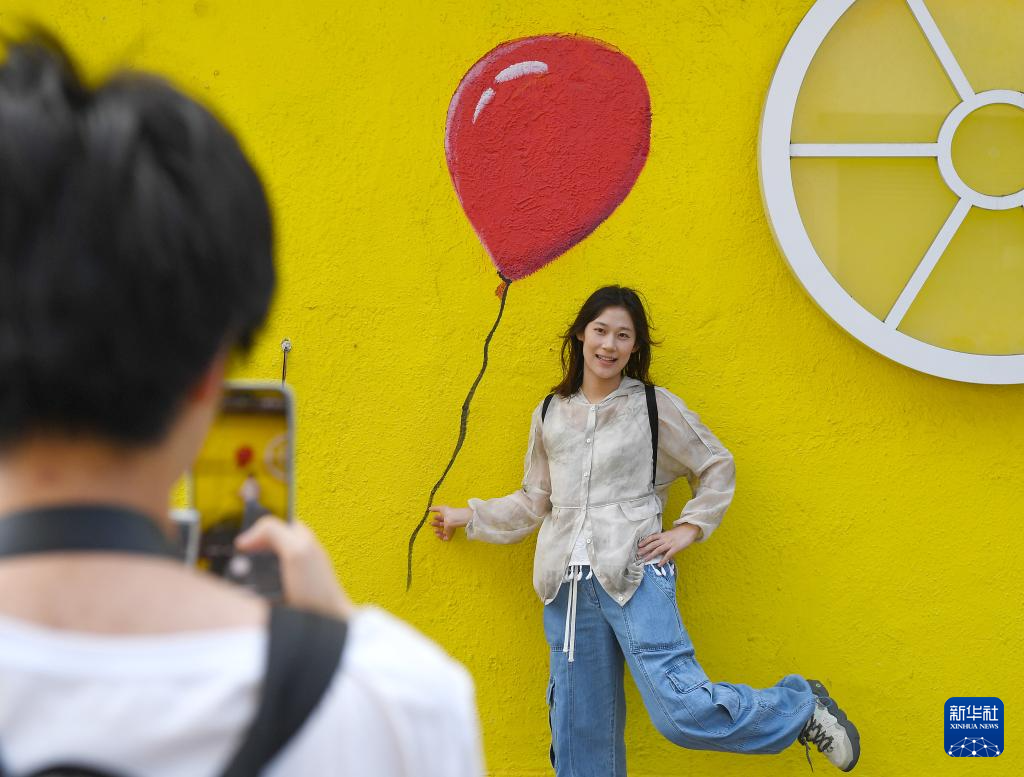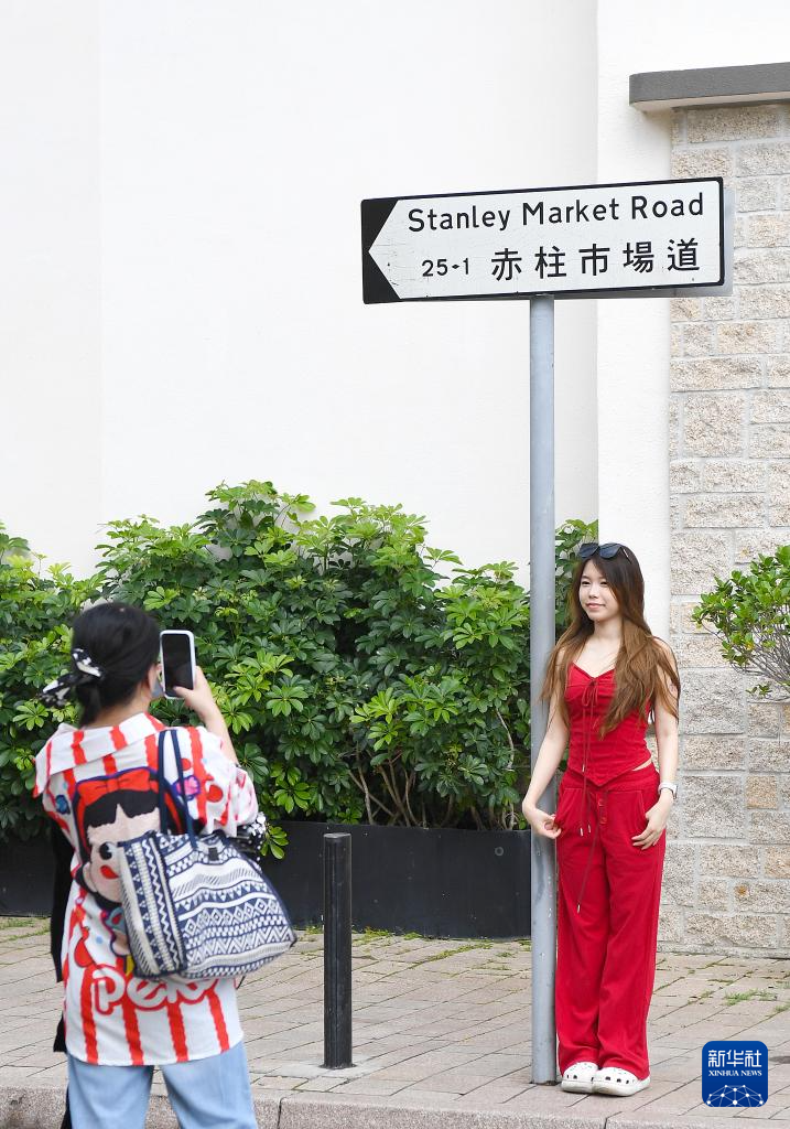 5月4日,游客在香港赤柱市场道打卡拍照。新华社记者 陈铎 摄