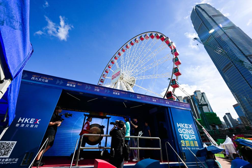 为庆祝香港交易所成立25周年,港交所举办了“金锣巡礼”活动。“金锣平时只在上市仪式上出现,今天在室外参观觉得很有趣。”采访团成员来到中环时看到金锣感到十分新奇,纷纷登上“金锣巡游号”巡游车打卡留念。