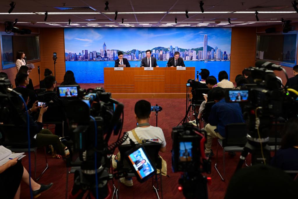 6月23日,香港特区政府署理财政司司长黄伟纶(中)等人士会见传媒。新华社记者 朱炜 摄