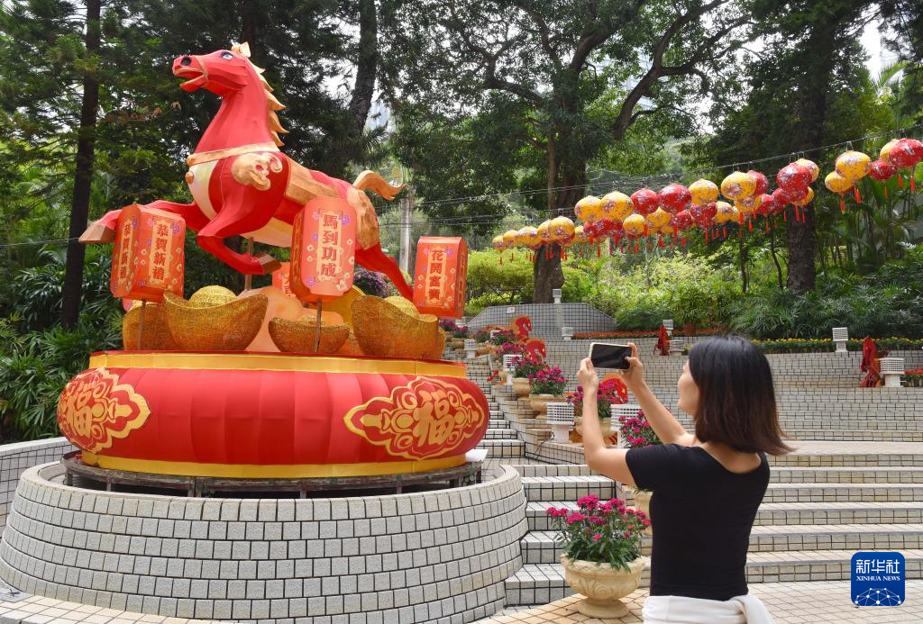 2月4日,一名女士在香港公园拍摄马年花灯。新华社记者 陈铎 摄