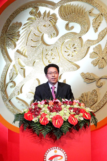 图为张晓明主任在酒会上致辞。(图片来源:中央政府驻港联络办)