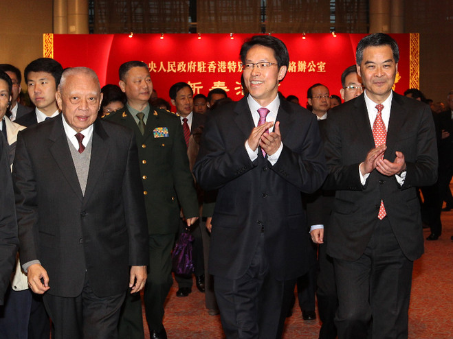 图为张晓明主任和应邀前来参加酒会的全国政协副主席董建华、香港特区行政长官梁振英等嘉宾一起步入会场。(图片来源:中央政府驻港联络办)