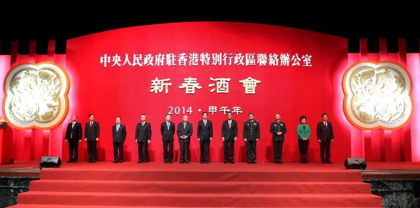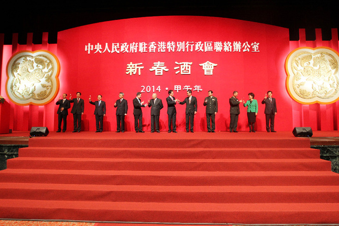 本网讯 灵蛇悠游去,骏马踏春来。2月13日晚,中央政府驻港联络办在香港会展中心新翼三楼大会堂举行2014年新春酒会。中联办主任张晓明,副主任黄兰发、王志民、殷晓静、杨建平、林武、杨健,与应邀出席酒会的全国政协副主席董建华、香港特区行政长官梁振英、外交公署特派员宋哲、驻港部队司令员王晓军、政委岳世鑫及来自中央驻港机构、香港特区政府、驻港中资企业、外国驻港领事官员和香港社会各界的4500余名嘉宾欢聚一堂,共庆新春佳节。