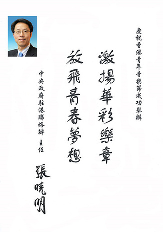 本网讯 5月30日傍晚,由亚太日报和香港华菁会主办的“香港青年音乐节2014”在香港维多利亚港畔的中西区海滨长廊举行。全国政协副主席董建华、香港特区行政长官梁振英、中央政府驻港联络办主任张晓明为音乐节题词,鼓励青年人勇于追逐梦想。梁振英、中央政府驻港联络办副主任林武等出席并主礼开幕式。