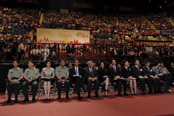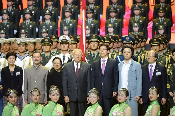 本网讯 7月2日晚,中国人民解放军驻香港部队在红磡体育馆举办音乐舞蹈诗剧《中国梦》。全国政协副主席董建华、香港特区行政长官梁振英、中央政府驻港联络办主任张晓明、驻港部队司令员王晓军、中联办副主任林武、香港特区政务司司长林郑月娥、外交部驻港公署副特派员姜瑜等应邀主礼并观看演出。