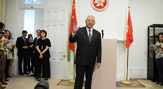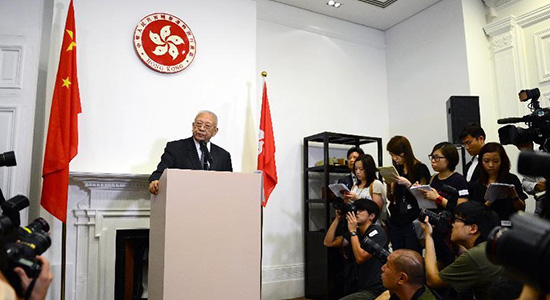 9月3日,全国政协副主席董建华会见传媒。董建华表示支持全国人大常委会关于香港特别行政区行政长官普选问题和2016年立法会产生办法的决定,坚决反对“占领中环”。(新华社记者 秦晴 摄)