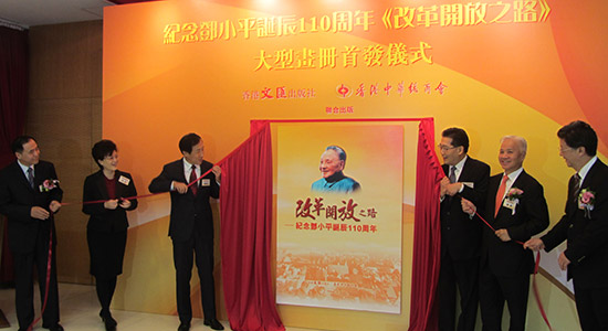 由香港文汇出版社、香港中华总商会联合出版,纪念中国改革开放总设计师邓小平诞辰110周年的大型画册《改革开放之路》31日正式在港发行。中央政府驻港联络办副主任杨建平、外交部驻港特派员公署副特派员姜瑜、香港特区政府商务及经济发展局局长苏锦樑等逾80位嘉宾出席首发仪式。