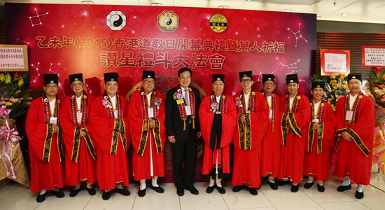 林武副主任(左五)主礼乙未年(2015)香港道教日开幕典礼暨万人祈福赞星礼斗大法会。(图片来源:中央政府驻港联络办)