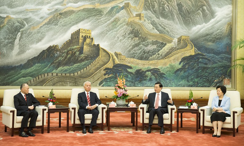 7月21日,中共中央政治局常委、全国人大常委会委员长张德江在北京人民大会堂会见以港区全国政协委员杨钊先生为团长的香港中华总商会访京团全体成员。新华社记者黄敬文摄