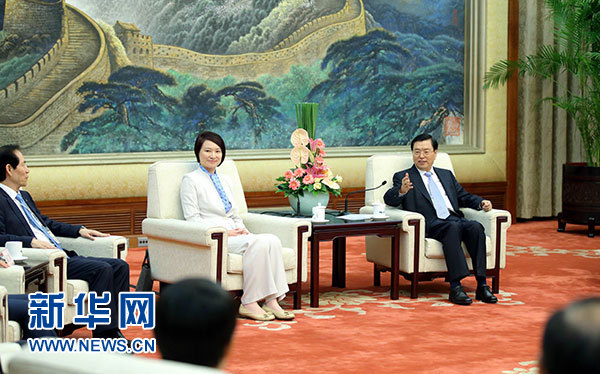 7月24日,中共中央政治局常委、全国人大常委会委员长张德江在北京人民大会堂会见以李慧琼主席为团长的香港民主建港协进联盟访京团。新华社记者 鞠鹏 摄