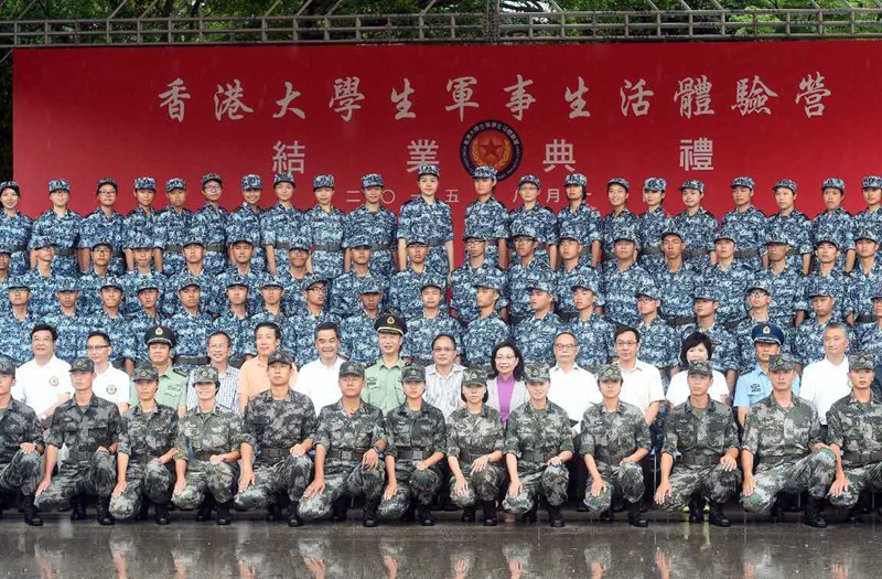 本网讯 8月15日,第五届“香港大学生军事生活体验营”在解放军驻港部队新围军营举行结业典礼。中央政府驻港联络办副主任杨建平与香港特区行政长官梁振英及夫人梁唐青仪、驻港部队政委岳世鑫、外交部驻港公署副特派员胡建中等担任主礼嘉宾。