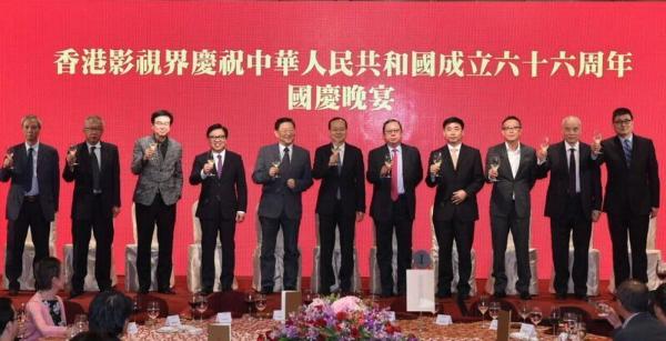 本网讯 香港影视界庆祝国庆66周年晚宴22日在金钟举行。中央政府驻港联络办副主任杨健、寰亚集团主席林建岳、香港电影工作者总会会长吴思远、香港艺术发展局主席王英伟、香港电影导演会会长刘伟强、香港电影制作发行协会理事长黄百鸣、香港影业协会理事长洪祖星、香港戏院商会会长陈荣美、银都机构董事长陈一奇和华南电影工作者联合会理事长张康达出席并担任主礼嘉宾。香港影视界共400多人参加活动。