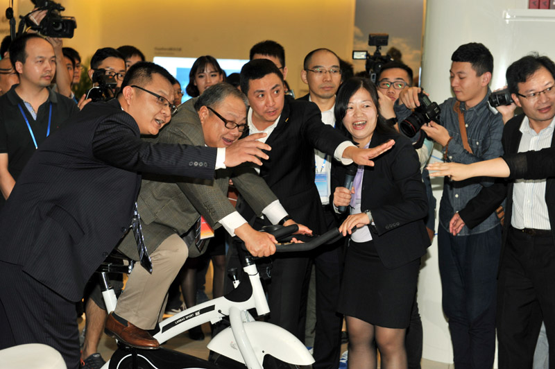 陈永棋在华为公司展厅体验模拟骑车