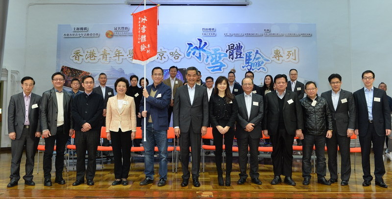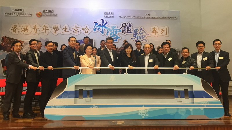 本网讯 1月2日下午,“香港青年学生京哈冰雪体验专列”活动在港举行启动礼,特区政府行政长官梁振英、中央政府驻港联络办副主任仇鸿、特区政府教育局局长吴克俭等到场主礼。