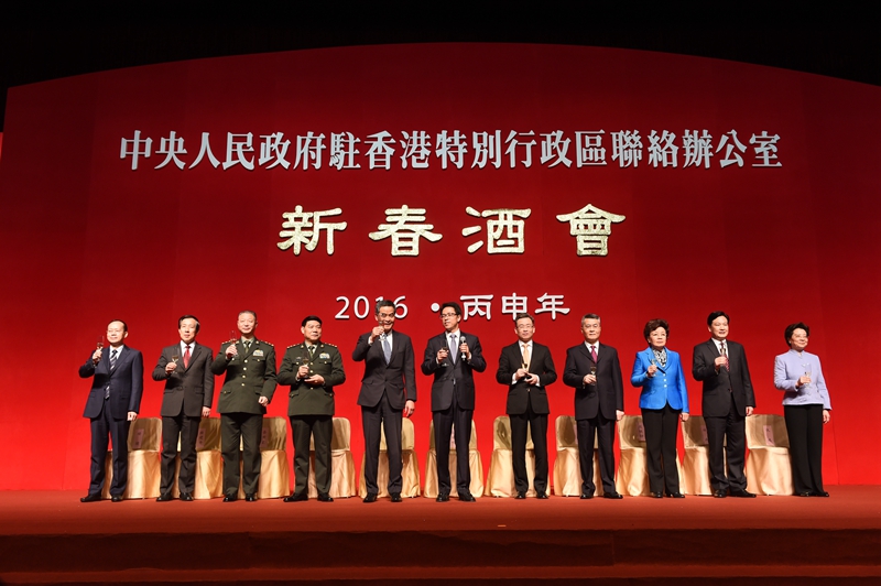 本网讯 每年春节前后,香港社会各界都会举办各种形式的春茗活动,联络感情,互祝新年。1月26日晚,一年一度香港最大规模的春茗活动——2016年中央政府驻港联络办新春酒会在香港会展中心新翼三楼大会堂举行。中联办主任张晓明,副主任黄兰发、殷晓静、杨建平、林武、杨健、仇鸿,与应邀出席酒会的香港特区行政长官梁振英、外交公署特派员宋哲、驻港部队司令员谭本宏、政委岳世鑫及来自中央驻港机构、香港特区政府、香港社会各界、驻港中资企业和外国驻港使领馆的近4000名嘉宾欢聚一堂,共迎新春。