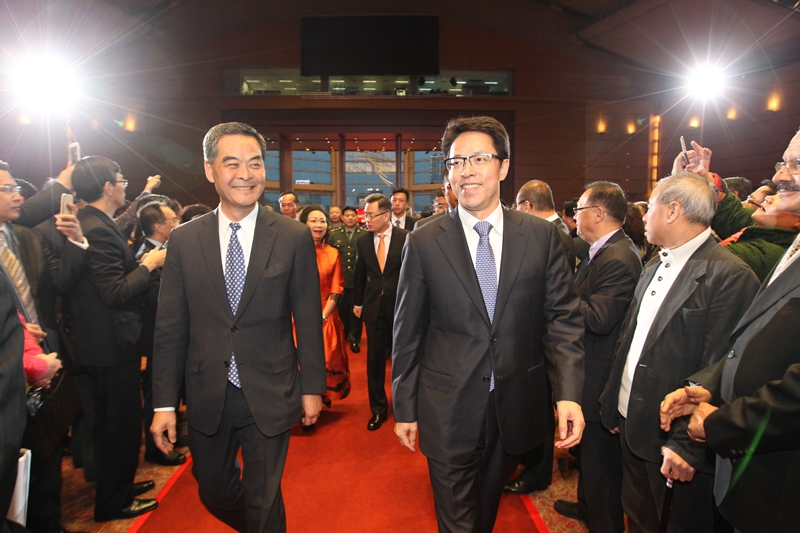 张晓明主任和应邀前来参加酒会的香港特区行政长官梁振英等嘉宾一起步入会场