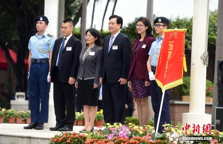随后,中央驻港联络办副主任林武、外交部驻港特派员公署署理特派员佟晓玲向担任本次升旗仪式的升旗手颁发“五四旗手”荣誉旗,4名升旗手分别来自民众安全服务队和航空少年团。