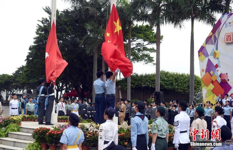 8时许,在香港儿童合唱团领唱的国歌声中,中华人民共和国国旗和香港特别行政区区旗冉冉升起。负责升旗仪式的仪仗队、护旗队、乐队、升旗手均来自香港各青少年制服团体。