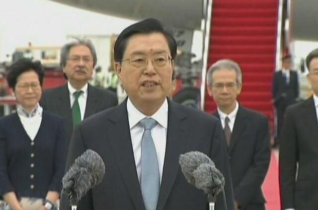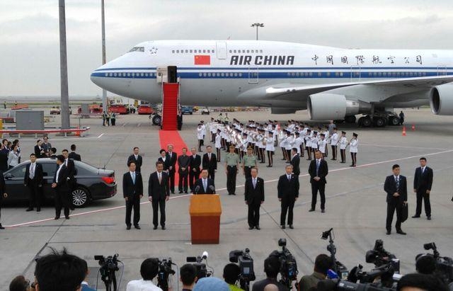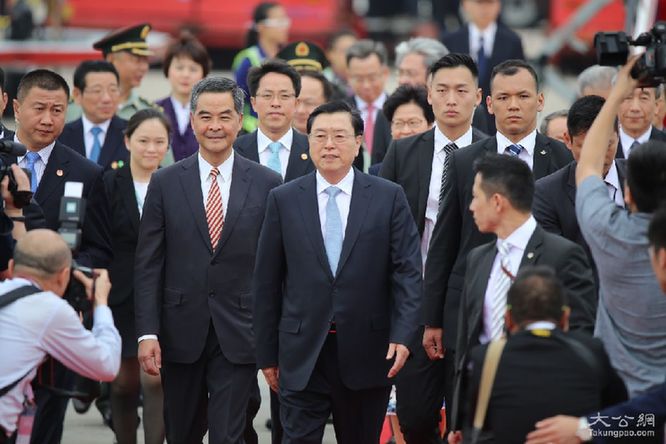 中共中央政治局常委、全国人大常委会委员长张德江乘专机抵达香港。(图片来源:大公网)