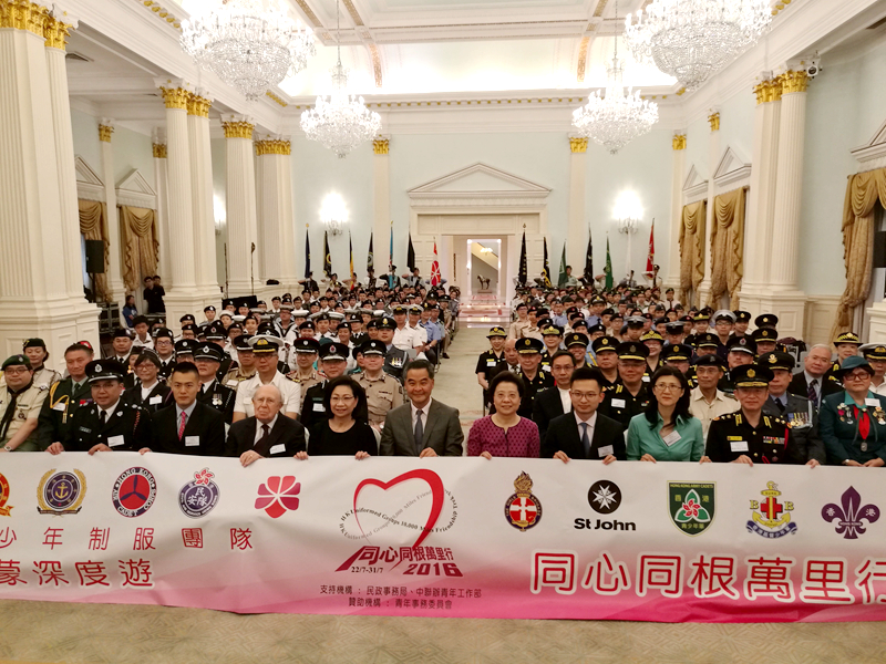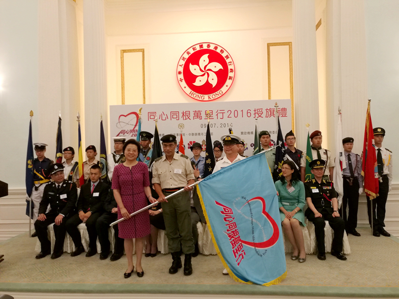 本网讯 7月9日,香港14家青少年制服团体在香港礼宾府联合举办“同心同根万里行2016”授旗仪式,香港特区行政长官梁振英和中央政府联络办副主任仇鸿共同主礼,并为交流团代表授旗。