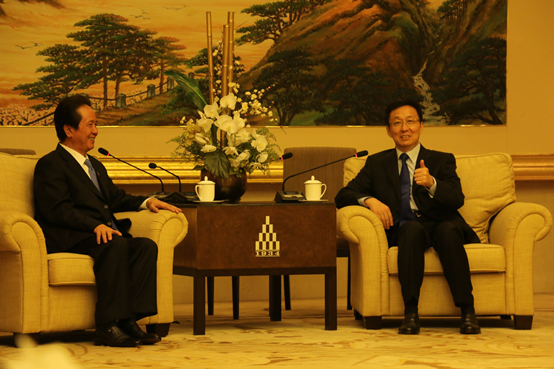 上海市委书记韩正会见陈经纬(左)率领的香港中国商会访问团。(图片来源:中央政府驻港联络办)