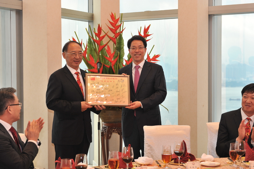 刘鹏局长代表内地奥运精英代表团向我办致送代表团签名纪念品。(图片来源:中央政府驻港联络办)