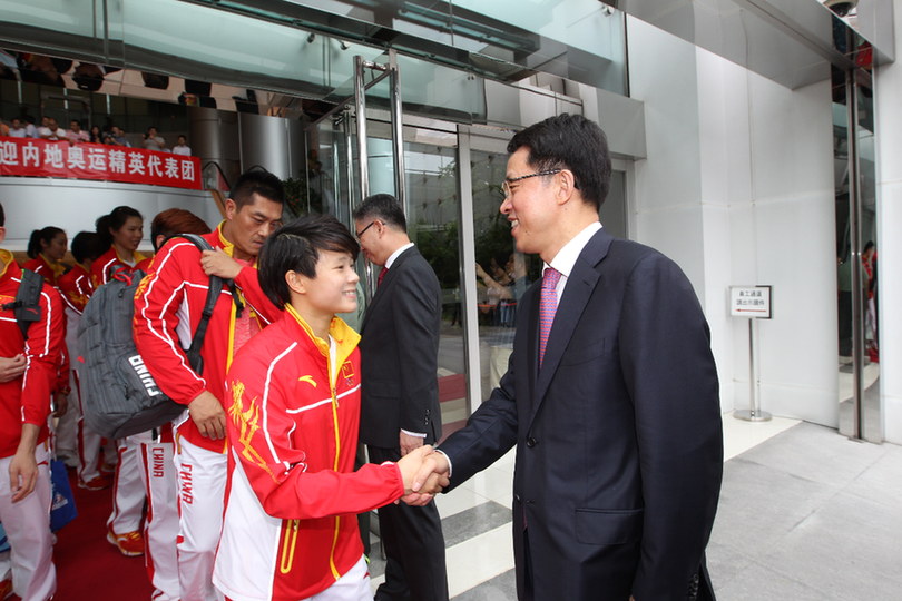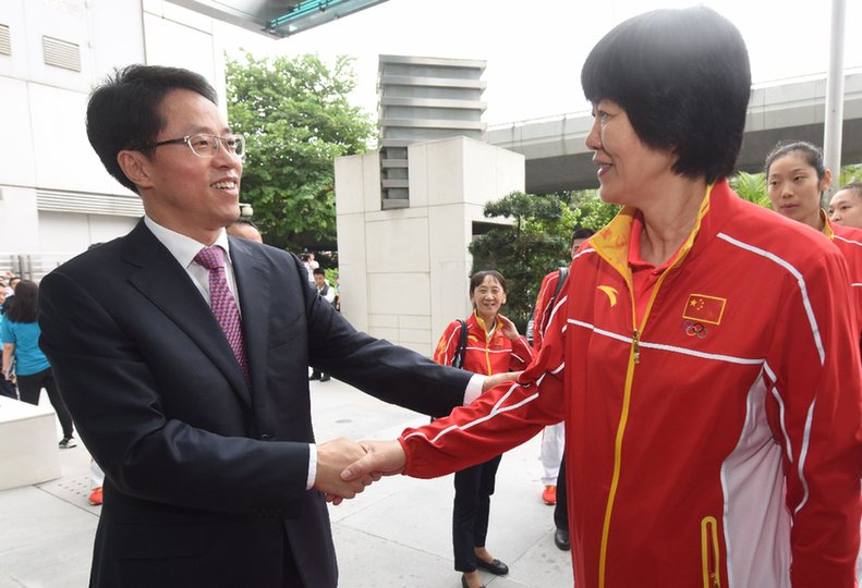 张晓明主任等领导在我办门口欢迎里约奥运会内地奥运精英代表团。图为张主任与郎平亲切握手。(图片来源:中央政府驻港联络办)