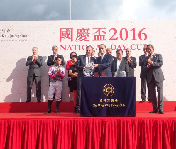 本网讯 10月1日下午,香港赛马会庆祝中华人民共和国成立67周年赛马活动在沙田马场举行。我办副主任杨健出席活动并为“国庆杯”赛事颁奖。