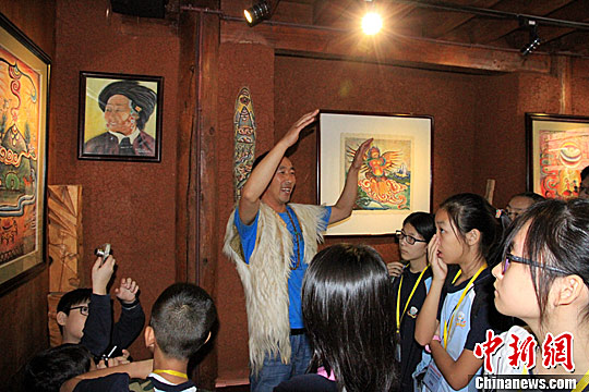 学生们在听纳西族人讲解纳西族绘画艺术和神话传说。中新社记者 吕少威 摄