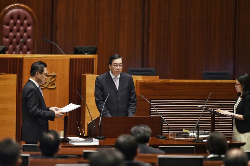 10月12日,第六届立法会主席梁君彦(中)在会议上。当日,香港特区第六届立法会举行首次会议,会议首先进行了议员就职宣誓仪式。随后,由议员互选产生新一届立法会主席,梁君彦当选。