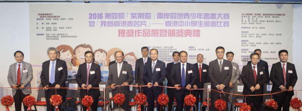 本网讯 11月6日下午,2016第四届“紫荆杯”两岸四地青少年书画大赛暨“我为香港画名片”——香港中小学生绘画比赛获奖作品展及颁奖典礼在香港大会堂举行。我办副主任杨健、外交部驻港特派员公署副特派员胡建中、香港特区政府教育局局长吴克俭、香港美协主席萧晖荣、香港教育工作者联会会长黄均瑜等出席并担任主礼嘉宾。