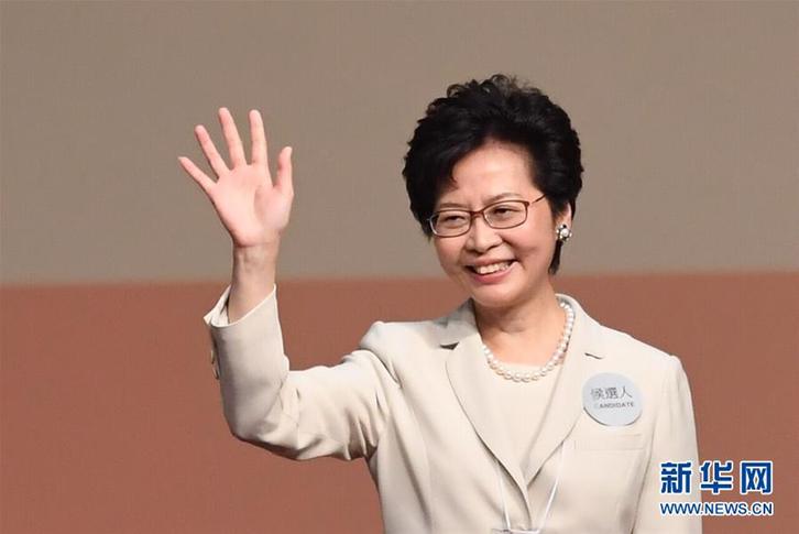 3月26日,林郑月娥在香港特区第五任行政长官选举中胜出,其得票已超过选举条例规定的600张有效选票。这是林郑月娥胜出后挥手致意。新华社记者 吕小炜 摄