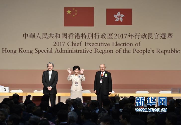 3月26日,林郑月娥在香港特区第五任行政长官选举中胜出,其得票已超过选举条例规定的600张有效选票。这是林郑月娥(中)胜出后挥手致意。新华社发(王申摄)