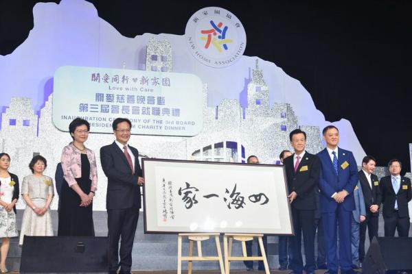 本网讯 6月10日晚,香港新家园协会关爱慈善晚会暨第三届会长会就职典礼在香港会展中心举行。我办副主任陈冬应邀出席,与全国政协副主席董建华,全国政协副主席、香港特区行政长官梁振英,候任行政长官林郑月娥,立法会主席梁君彦等嘉宾共同主礼,并向新家园协会赠送张晓明主任亲笔题词“四海一家”。