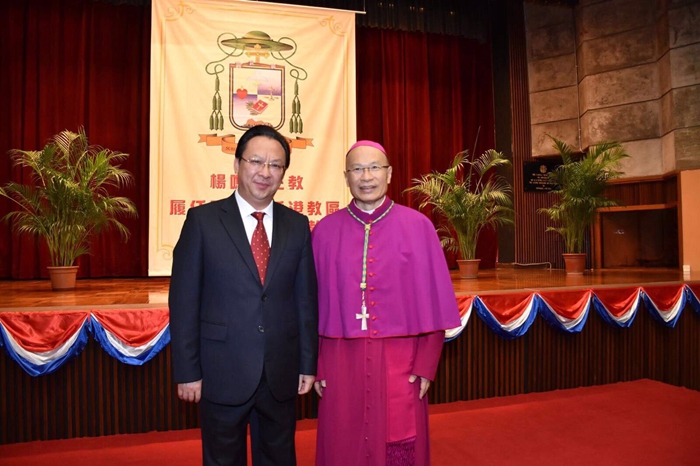 谭铁牛副主任与杨鸣章主教合影(图片来源:中央政府驻港联络办)