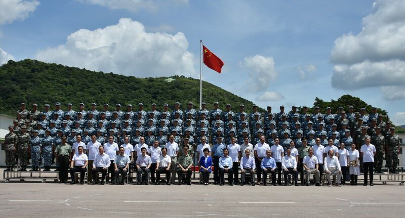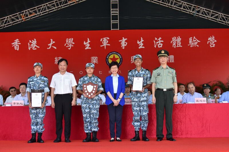 本网讯 8月13日,第七届香港大学生军事生活体验营结业典礼在驻港部队新围军营举行,我办副主任陈冬和香港特区行政长官林郑月娥、外交部驻港公署特派员谢锋、解放军驻港部队政委岳世鑫等共同主礼了该活动。结业礼上,学员们身着迷彩服,用整齐的队列、军体拳和嘹亮的军歌合唱表演,向到场的嘉宾和亲友们展示了训练成果。