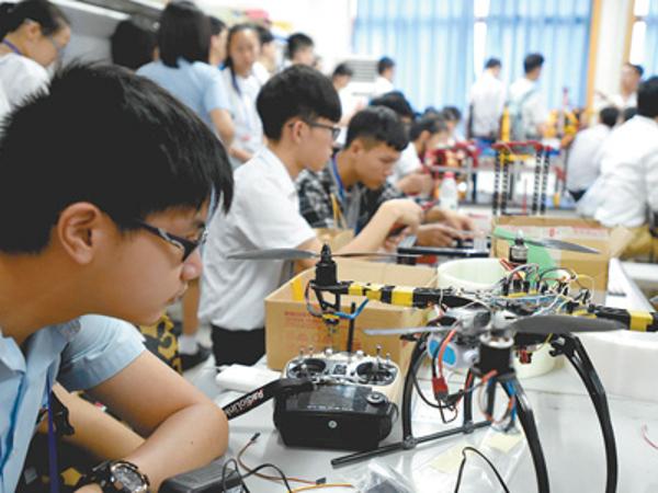 随着两地交流日益频繁,越来越多的香港中学生利用暑期走进内地。7月28日,香港120所中学的120名高中学生,来到陕西西安交通大学,开展香港“2017北京、西安航天科技考察团”走进西安交大体验高新科技创新和发展主题活动。图为来自香港的中学生正在西安交通大学工程坊参观机器人。(张树忠 摄)