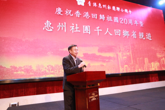 本网讯 11月19日,香港惠州社团联合总会在广东省惠州市举办庆祝香港回归祖国20周年暨惠州社团千人回乡省亲联欢晚会。我办副主任何靖应邀出席并致辞。