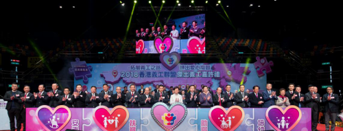 本网讯 1月11日,香港义工联盟在伊丽莎伯体育馆举行2018年杰出义工嘉许礼,我办副主任何靖应邀出席,并与香港特区行政长官林郑月娥、特区政府政务司司长张建宗、特区政府民政事务局局长刘江华、特区政府教育局局长杨润雄、中华海外联谊会副秘书长仇昱等共同担任主礼嘉宾。