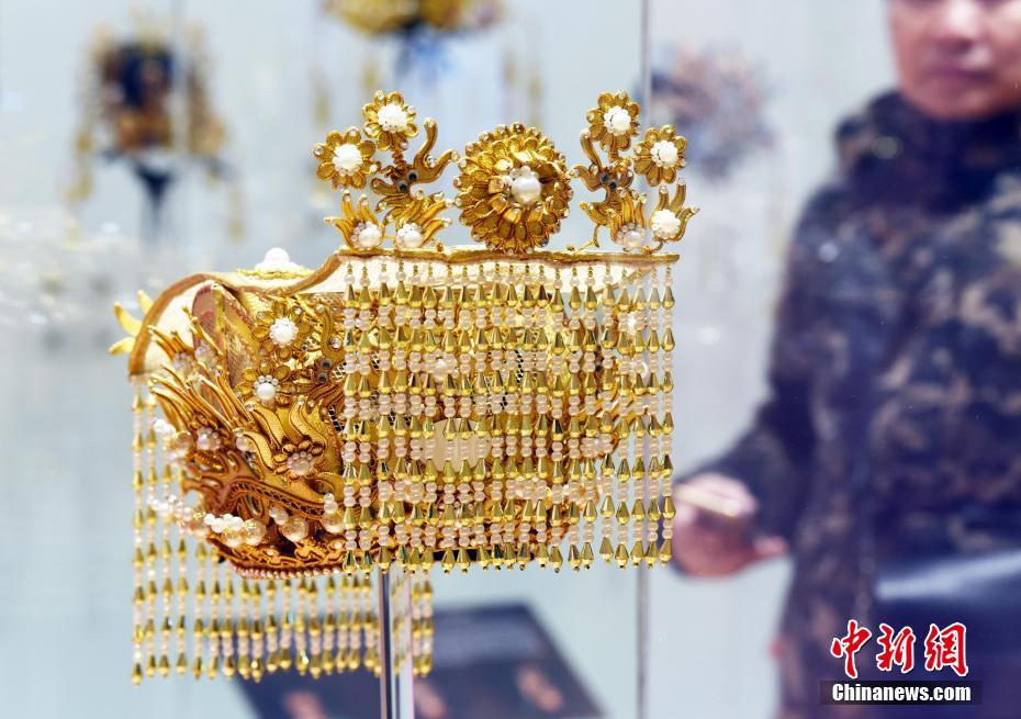 这些帽饰做工精致,色彩绚丽,俨然一件件工艺品。展出的帽饰都出自戏曲帽饰制作大师陈国源。中新社记者 谭达明 摄