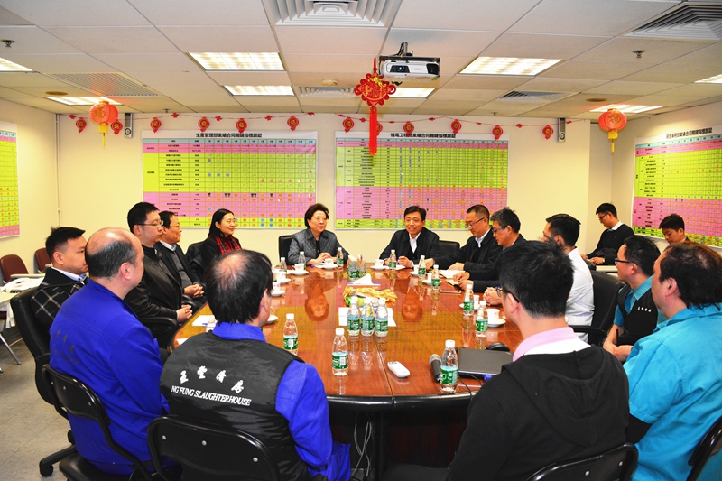 上水屠房建成于上世纪90年代,由华润五丰屠房(香港)有限公司经营。上水屠房在保障香港市场鲜肉供应方面发挥着举足轻重的作用,香港市场供应的90%活猪、100%活牛和100%活羊均由上水屠房宰杀。仇鸿听取了上水屠房管理人员情况介绍,了解询问了香港活畜市场需求供给状况、企业生产经营情况、以及卫生检疫和环境保护措施。仇鸿还与部分员工代表座谈,询问他们的工作和生活情况,倾听他们的要求和希望,并致以节日问候。