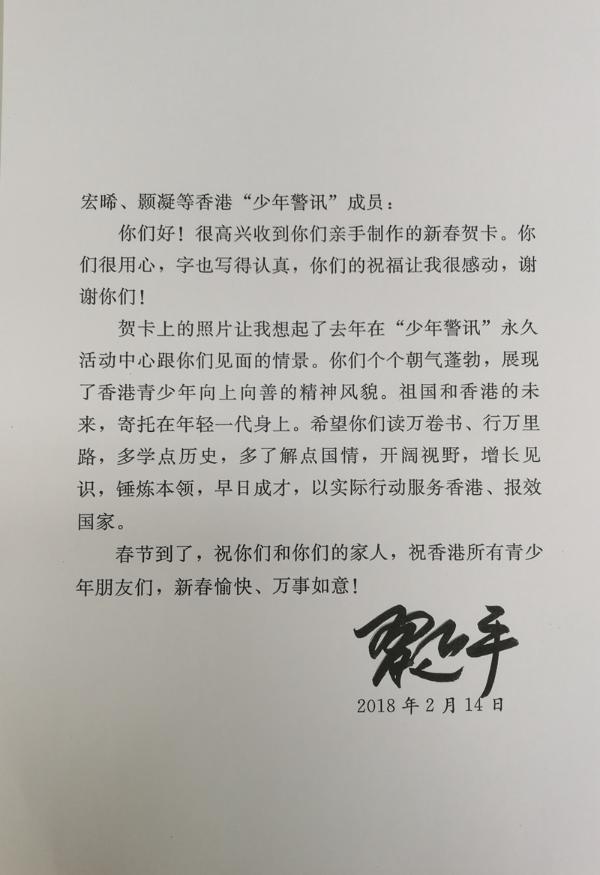 香港警务处处长卢伟聪代表香港警队和“少年警讯”全体学员对习主席表示衷心感谢!郭宏晞、罗颢凝同学代表到场的香港“少年警讯”成员发言时表示,没想到习近平主席在百忙之中会亲自给他们回信,感到非常荣幸和兴奋,希望可以有机会再和习主席见面。他们再次祝福习主席和夫人新春快乐。