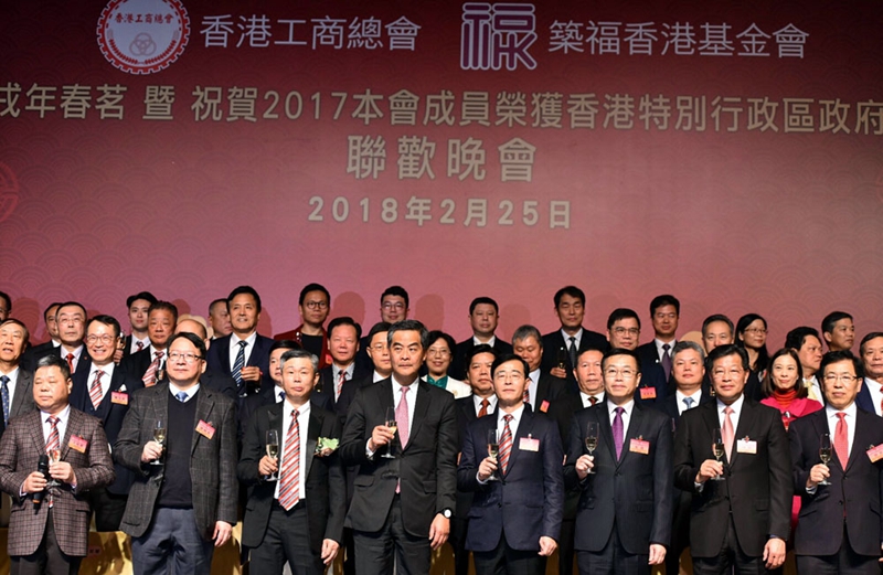 本网讯 2月25日晚,香港工商总会、筑福香港基金会2018戊戌年春茗暨祝贺成员荣获特区政府授勋嘉奖联欢晚会在香港会展中心举行,我办副主任何靖应邀出席,并与全国政协副主席梁振英、广东省政协副主席林雄、香港特区特首办主任陈国基等共同担任主礼嘉宾。逾千名社会贤达出席活动。