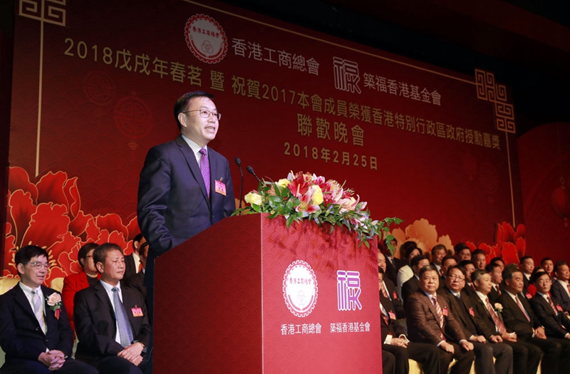 何靖在致辞中表示,过去一年是国家、香港和香港工商总会收获丰盛的一年。中国特色社会主义进入新时代,开启了建设富强民主文明和谐美丽社会主义现代化强国的新征程,国家从未像现在这样接近世界舞台的中心,人民的获得感、安全感、幸福感前所未有地充实。香港新一届特区政府开局良好,社会稳定,百业兴旺,这是在场各位工商界朋友以及社会各界共同努力的成果,也是与国家的支持分不开的。香港工商总会务实工作、服务市民、推动经济社会发展,得到特区政府和社会各界的认同肯定,许多会员获特区政府授勋嘉奖就是最好证明。