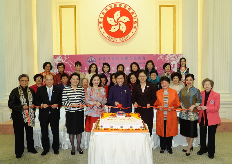本网讯 3月21日下午,香港各界妇女联合协进会与148个妇女团体在香港礼宾府联合举办“2018年香港各界妇女庆祝‘三八’国际妇女节酒会”。我办副主任仇鸿与香港特区行政长官林郑月娥,全国妇联副主席、书记处书记夏杰,特区政府政务司司长张建宗,外交部驻港公署特派员谢锋夫人王丹等出席并主礼。